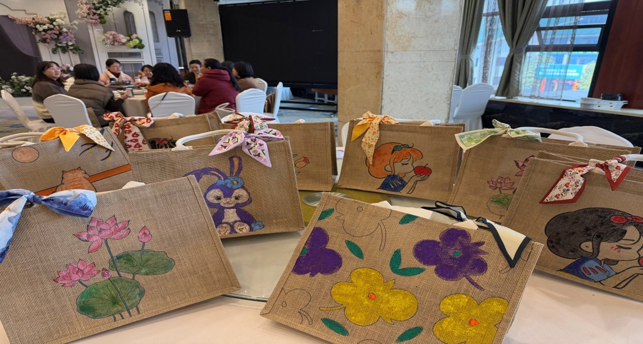 女教职工们迅速投入创作,调色、勾勒、填充,大家专注而认真,指尖流转间,一个个原本朴素的帆布包逐渐变得鲜活灵动、独具个性。“这个活动太有意义了,既能体验手工创作的乐趣,又能收获独一无二的专属提包,感觉自己的艺术细胞都被激活了!”完成作品的女教职工们互相展示、交流心得,现场洋溢着成就感与幸福感。