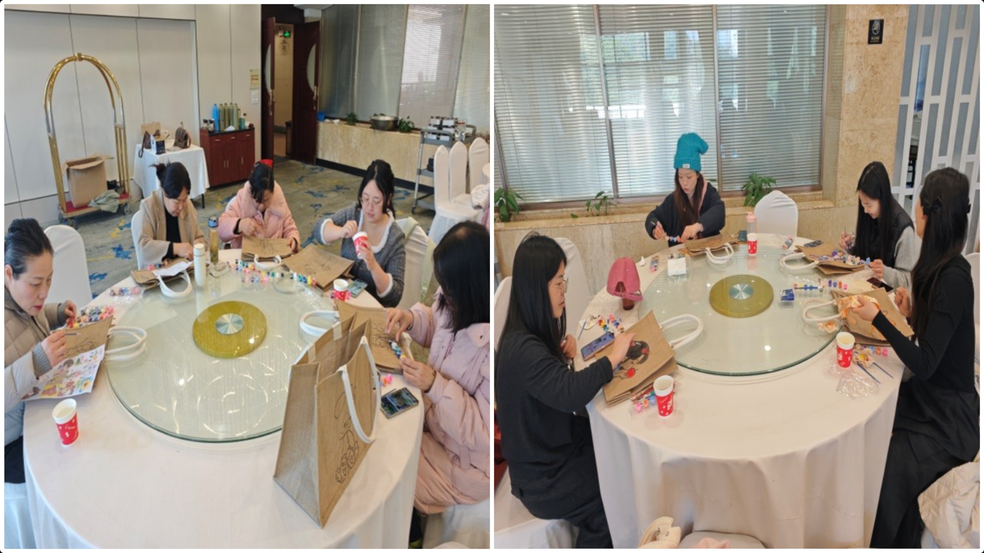 随后的迎宾楼二楼活动中心暖意融融,桌上整齐摆放着素色帆布包、环保颜料、画笔等创作材料,手工提包绘制环节精彩上演。工会邀请专业老师现场指导,老师从色彩搭配、图案设计、绘画技巧等方面进行细致讲解,鼓励大家发挥想象力,将春日美景、校园元素与个人创意融入作品。