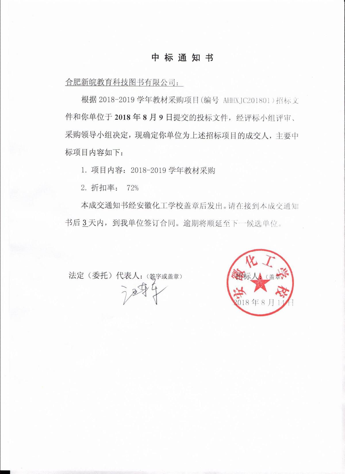2018-2019学年教材采购项目中标通知书