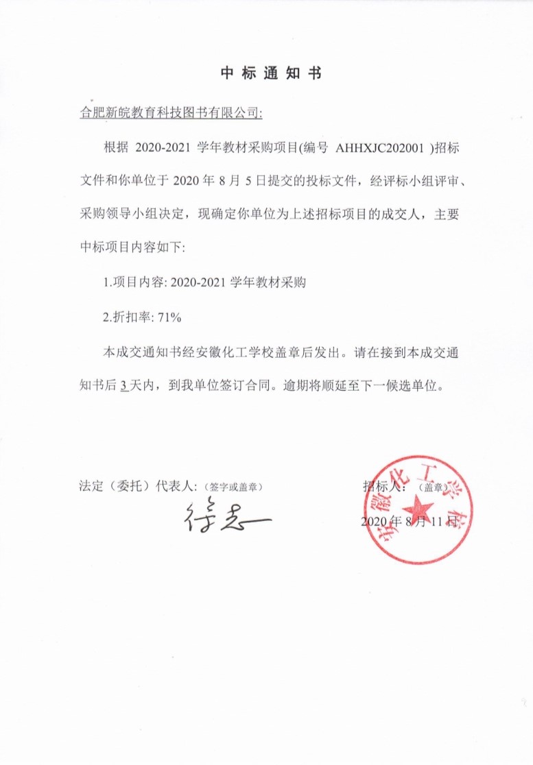安徽化工学校2020-2021学年教材采购项目中标通知书公示
